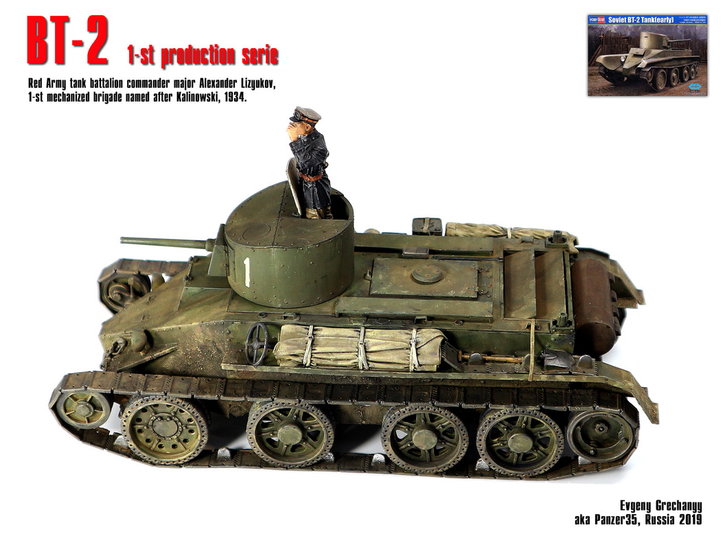 Отлично исполнено Евгений! Я так понимаю первый БТ-2 от ХБ на сайте. А мехводу нужно люлей отвесить, правая гусянка с провисом, слетит при движении "Вот только этого и не хватало, нашему славному гвардейскому экипажу..." Сержант Домешек, (На войне как на войне).