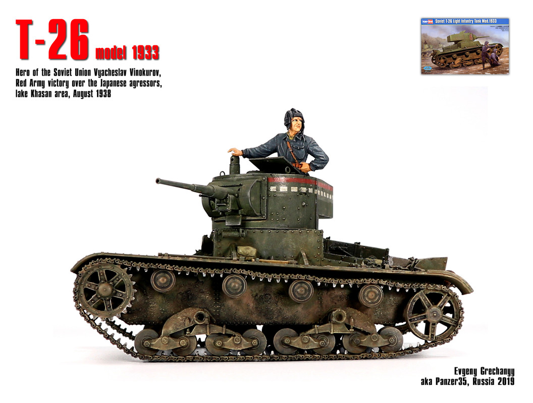 Моя история с Т-26 началась в 90-годы прошлого века. Тогда эту модель выпустила наша родная «Звезда» - собрал ее на диораму с БТ-5 на тему Халхин-Гола, вполне достойная модель для того времени. Китайская фирма Hobby Boss решила тоже приобщиться к Т-26, благо модификаций у него немало – есть где развернуться. Т-26 1933 года китайцы выпустили в 2013 году - на его 80-летний юбилей. Уже прошло немало времени с этого события, но в сети не так много собранных Т-26 от ХоббиБосса. Начав сборку понял почему.