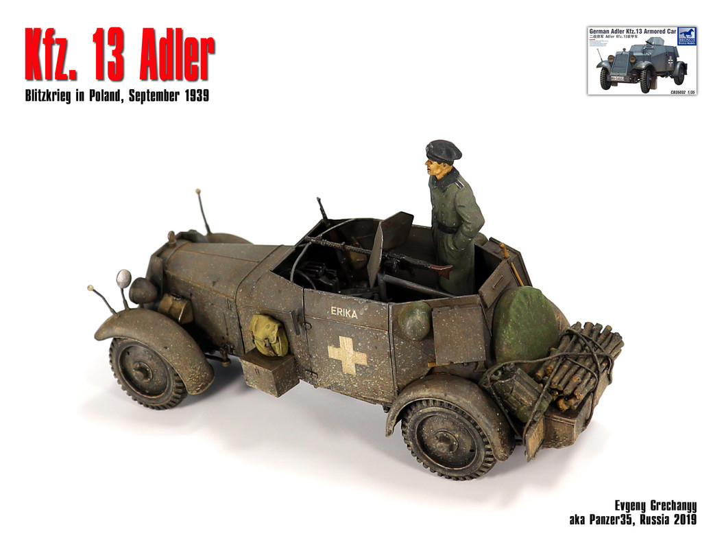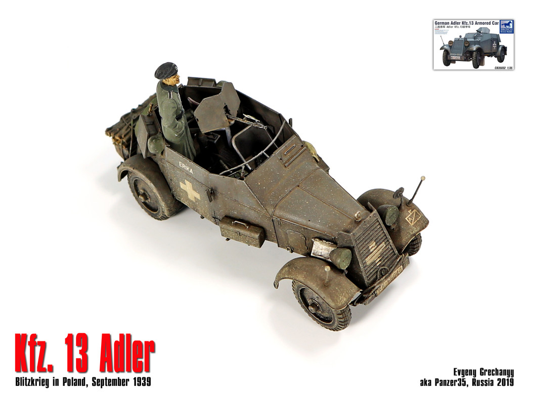 Здравствуйте уважаемые друзья! Предлагаю вашему вниманию модель броневика Kfz. 13 Adler от фирмы Bronco. Эта небольшая и неказистая машина, которую солдаты по-простому называли «корыто», стала первым серийным броневиком германской армии – сначала Рейхсвера, а потом и Вермахта. Не танк PanzerI был родоначальником Panzerwaffe,а вот этот колесный броневик. До него на учениях использовали только обычные автомобили. Машина была создана в 1932 году с использованием серийных авто компонентов, была недорогой и простой в освоении – как раз то что надо на начало 1930-х годов в Германии. С помощью этого броневика нарабатывался опыт технической эксплуатации бронированных машин, а так же отрабатывались тактические элементы их применения – для разведки и поддержки пехоты. Все это потом очень пригодилось при развертывании полноценной армии. Kfz.13 рассматривался как учебный, выпустили их немного – 147 шт, но из-за дефицита бронетехники в вермахте, ему пришлось повоевать в Польше, Франции и СССР. Китайская фирма Bronco выпустила модель Kfz. 13 Adler в 2009 году. Так как тема первого блицкрига немцев в Польше мне весьма интересна, то не смог пройти мимо. Набор имеет эффектный боксарт – художнику удалось передать особенности машины, ее угловатость – в сочетании с немецким серым цветом броневик выглядит довольно брутально. Модели фирмы Бронко как правило отличаются хорошим качеством, но и излишней разбивкой на детали. Здесь все это тоже присутствует: производитель максимально постарался усложнить модель. Эх, японская Тамия все сделала бы гораздо проще. Ну что делать, собираем то, что есть. У большинства элементов модели очень малые посадочные места – это добавляет сложностей при сборке, а при окраске-тонировке любая деталь может отвалиться – химия подъедает пластмассу.---Модель собрал «из коробки», добавил поклажу, которую экипаж мог разместить на такой маленькой машинке: ящик на борт, сумку, патронные ящики и канистры Condor,металлический трос, фашину, каски, карабин и автомат от Тамии. Красил и тонировал химией от Тамии.