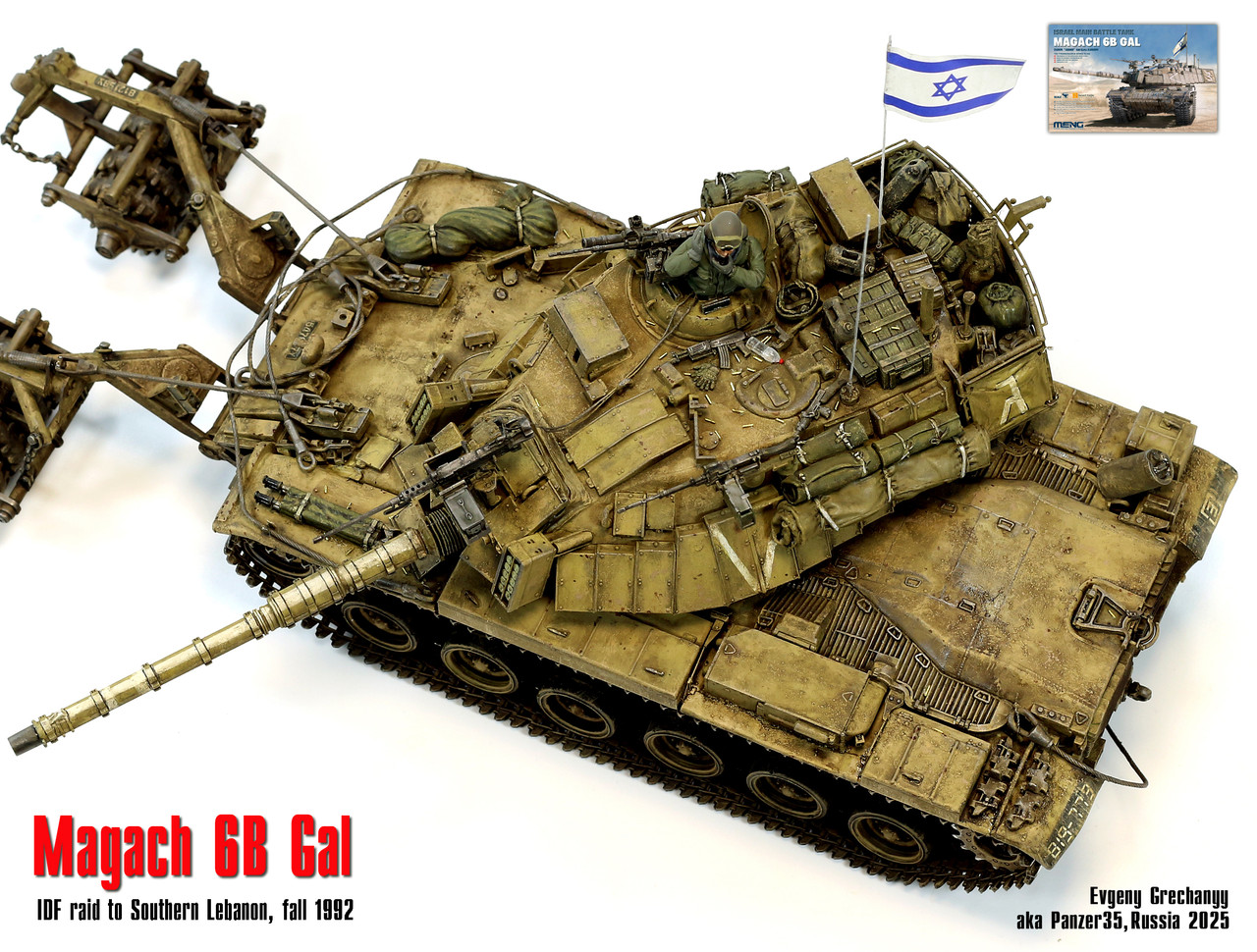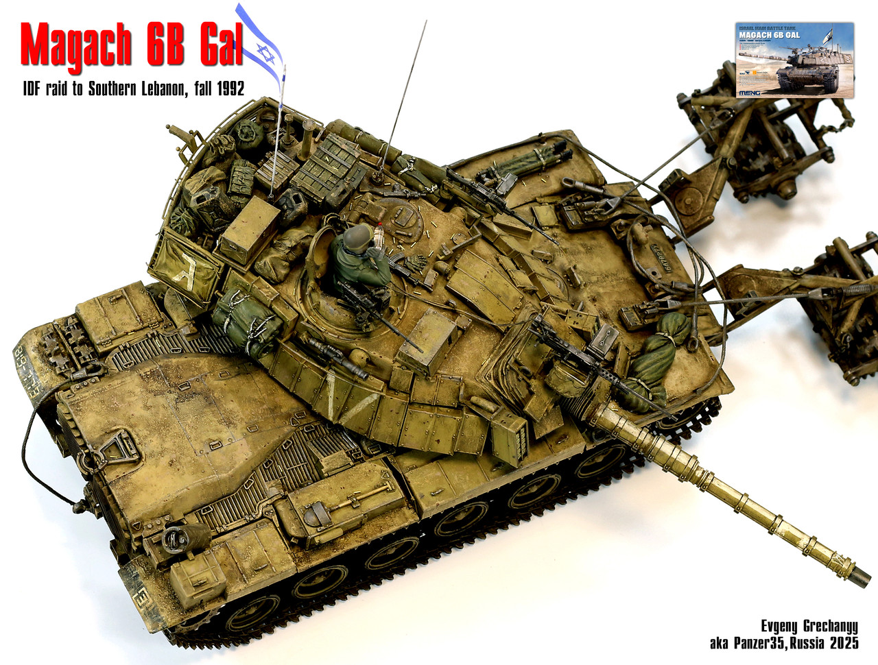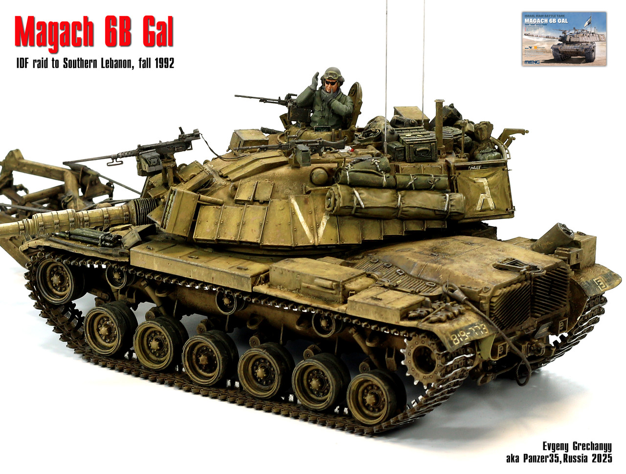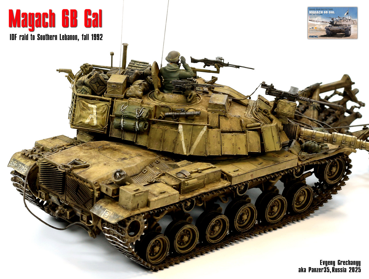 Модель Magach 6 B Gal китайская фирма Менг выпустила в 2019 году. До нее израильские М-60 делали корейская Академия и итальянская Италери – это были машины на первую Ливанскую войну 1982 года (если заменить ствол). В 2000-е годы корейская Legend выпустила смоляной конверсионный набор на эту модель, для превращения академовского «Магаха» в Magach6BGal.Даже купил эту конверсию, но так и не воспользовался – новая модель от Менга сделала ее ненужной.