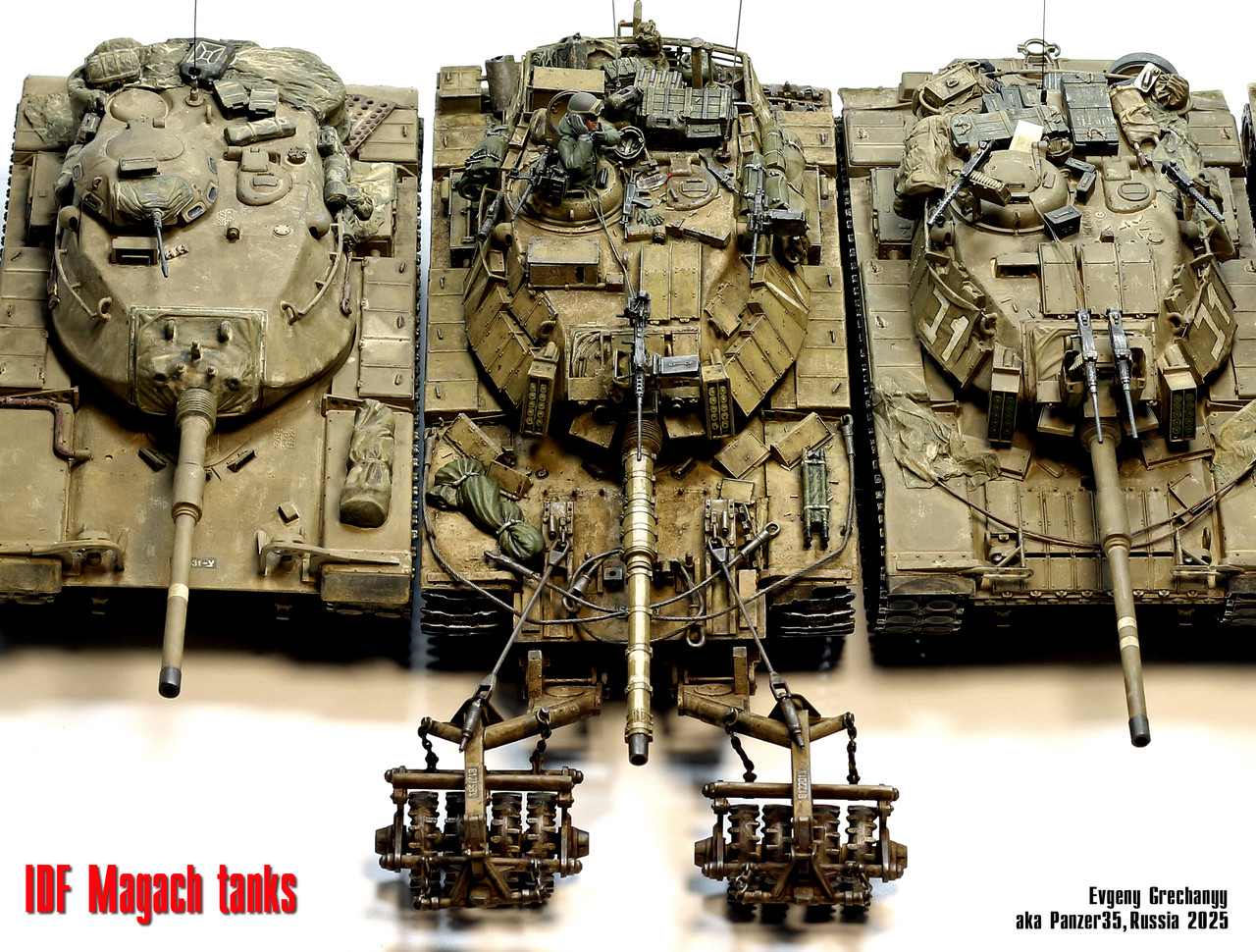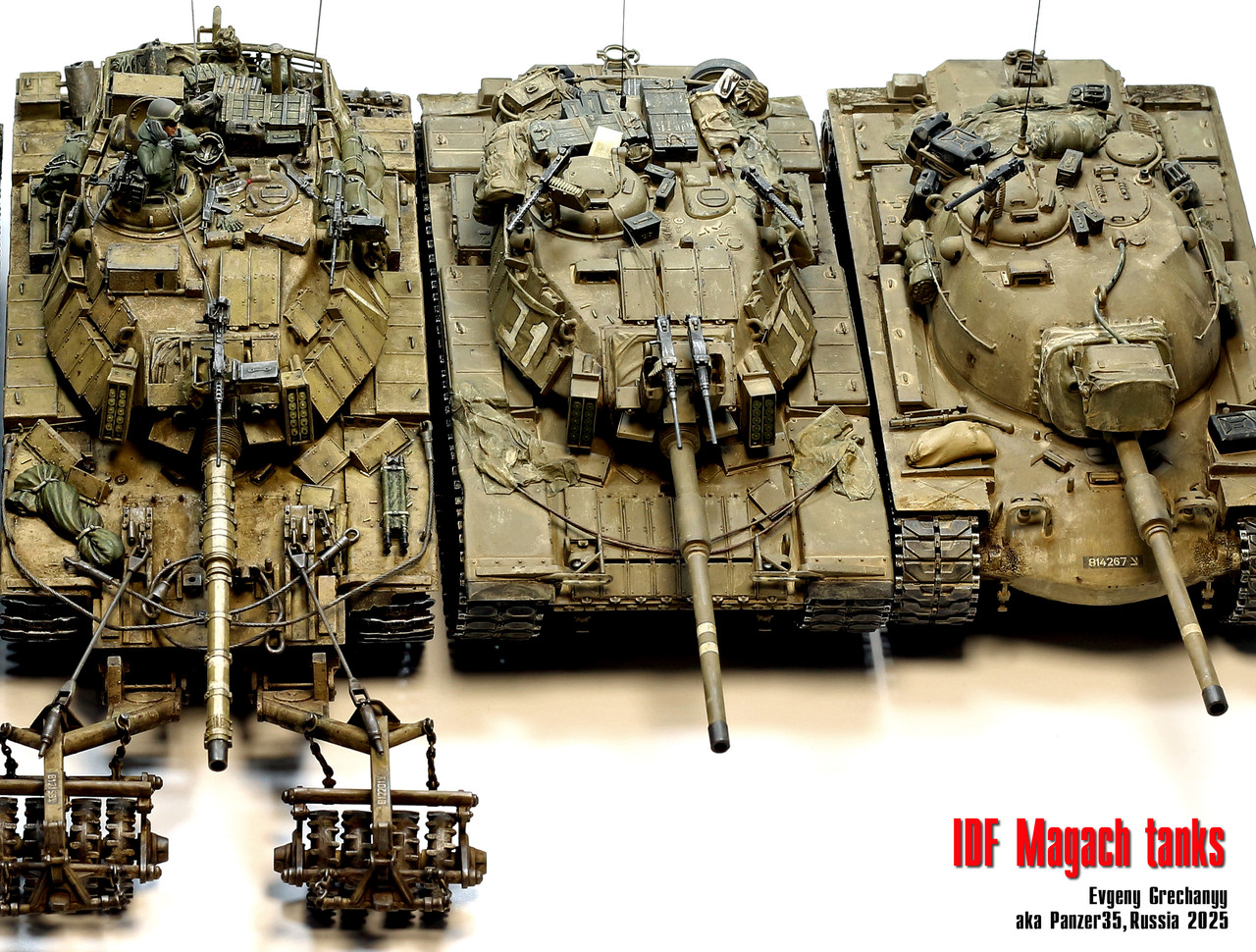 На лобовой броне танка реактивная броня снята, там проволокой имитировал штыри ее креплений. Крылья танка изогнул – так как они часто повреждаются. Подрезал и резиновые брызговики. Добавил проводку к пристрелочному 12,7-мм пулемету на башне, там же сделал рычажки тяг для стрельбы из него. Подобрал подходящую поклажу и закрепил ее на башне. Разместил металлические троса на танке, крепления для них на крыльях сделал их из фольги. После сборки израильского «Центуриона» остались складные носилки, и автоматы «Галил» и «Узи» - здесь они тоже пригодились. В закромах нашел бюст израильского танкиста, красил все тамиевским акрилом. После покраски добавил флаг Израиля от «Эдуарда».