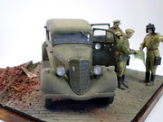 Приветствую. Пара работ,так сказать "первые в серии".Сразу скажу,как такового сюжета в работах нет. И фигуры расписывать не умею-стараюсь просто аккуратно покрасить. Первая-ГАЗ М1. Модель от звезды доработана минимально.Сделал тормозную систему,доработал обивку салона.Сделал различные тех.элементы на открытых дверях . В салон закинул сидр и ппш от тамии. ППШ также доработал-отверстия в кожухе, др.элементы ствольной коробки.Ремень из бумажной жести и тонкой проволоки. Доп.фара от эльф. Трофейные канистры-дракон. Фигурки от миниарта. С помощью тянутого литника,бумажной фольги и проволоки доработаны элементы униформы и амуниции. Награды-травло от армори. База из гипса,отлитого в пластилиновую форму. Битый кирпич собственно кирпич плюс гипс. Указатель из какой-то коробки миниарта. Красилось в основном худ.акрилом. Тонировка маслом и постельными мелками. С уважением,Александр.