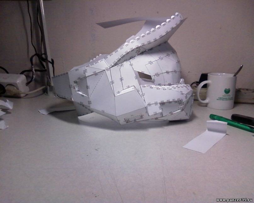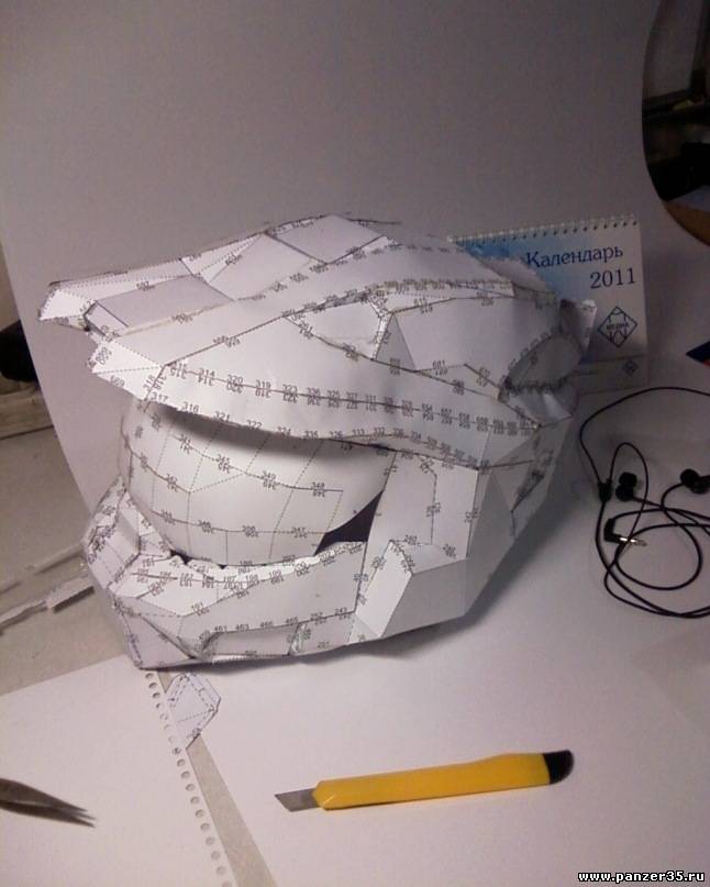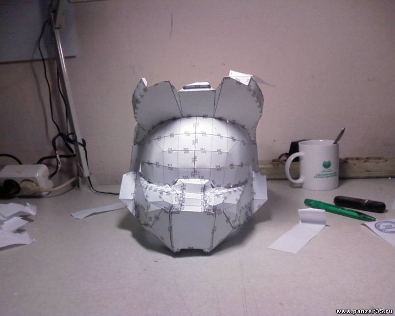 | ну и практический собранный каркас Добавлено (29.03.2011, 21:34) --------------------------------------------- ах да. восем забыл упомянуть. шлем делал из мелованной бумаги плотностью 280гр/м. на него ушло 8 листов А3 формата. часть деталей вырезал в ручную, часть на лазере. собирался шлем на цианокрилате и термоклее. когда бумажный каркас был готов, встал вопрос о его дальнейшем укреплении и устранении угловатости. долго думать не стал, позвонил другу который работает в рекламной мастерской, и выпросил у него 200 мл эпоксидки ЭД-20 на следующий день шлем был внутри и снаружи пропитан смолой. спустя 12 часов смола застыла и шлем приобрел жесткость и прочность. толщина бумаги была примерно 0.8 мм. после пропитки смолой толщина шлема стала примерно 3мм