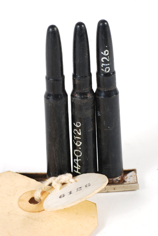 На верхней ленте чёрное гнездо для патрона выполнено в форме "пенальчика" и торчит оттуда только хвостик гильзы с закраиной. Форма пули скруглённая, не остроконечная.