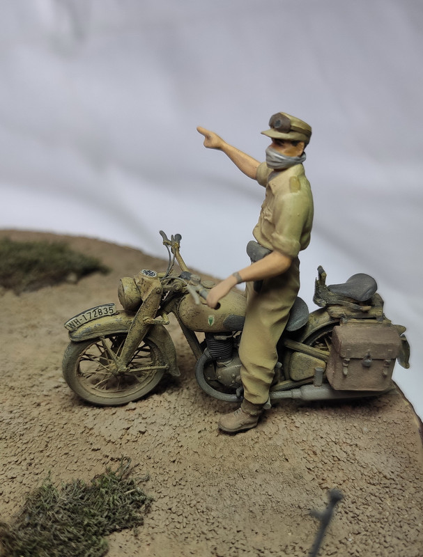 О технике про матчасть говорить большого смысла нет; единственный момент - "искоробочные" ровные покрышки, которые хороши для экспозиции на полке, здесь закономерно создали эффект "взлета" над поверхностью. Поэтому, на мой взгляд, на диорамах они требуют имитации приплюснутости (sagged) в нижней точке и углубления в почву. "Ландшафту" добавить бы разных оттенков окраски и сгладить фактуру, которая сейчас больше напоминает штукатурку. И конечно, добавить мелких камешков и мусора. Например, обрывка газеты или консервную банку в дополнение к обломку ящика на британской "позиции". Можно ориентироваться на такое: