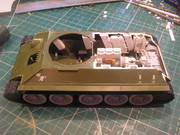 Я списался с упомянутым поляком, выпросил у него еще немного фото этого аппарата, после чего взялся за постройку модели. Основной задачей было строительство полностью выпотрошенного корпуса танка Т-34. Внутренности для Т-34 делают АФВ и Миниарт. Но они мне мало помогли. От АФВ взял коробку передач (миниартовская не подходит, она более ранняя, четырёхскоростная). От Миниарта взял бортовые фрикционы и рабочее место водителя. Всё остальное приходиться делать самому. Хвалёный Миниарт сделал баки сильно упрощёнными, про АФВ промолчу. Двигатель тоже с нуля делать приходится, ничего похожего не нашёл.