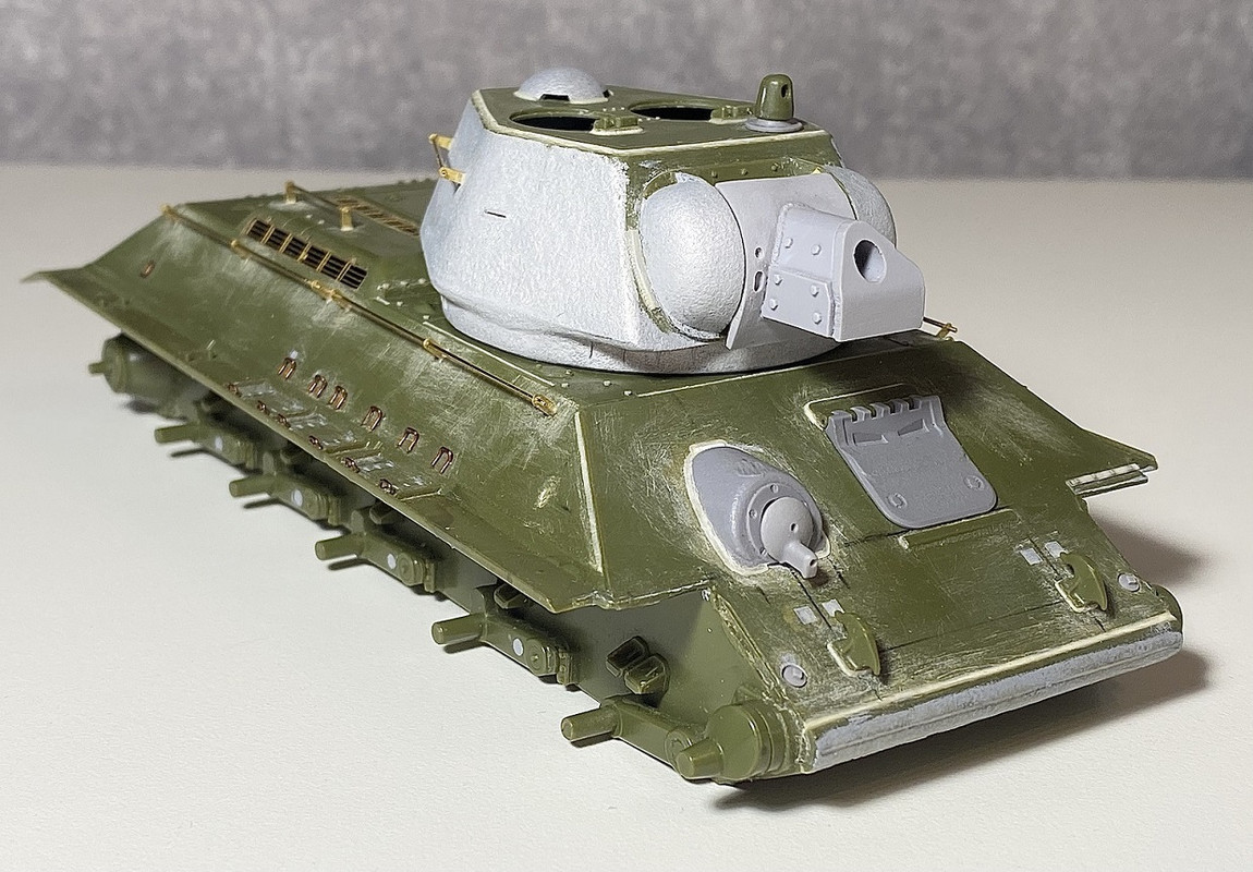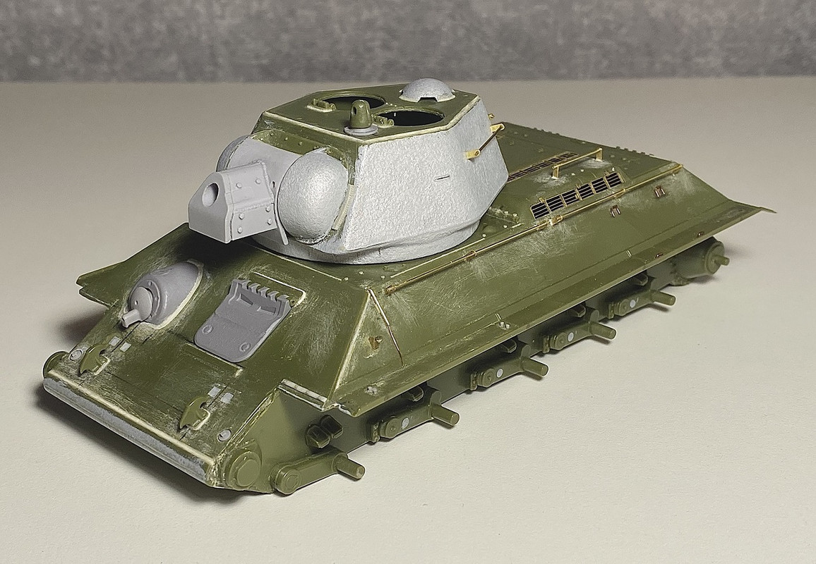 Добавлено (04.09.2025, 21:20) --------------------------------------------- На этапе доработки башни особую сложность вызвали т.н. "сглаженные кромки". Их геометрию выводил не раз и не два, а неделю. Работал так: утром зашпаклевывал, вечером выводил геометрию. Было тяжело в психологическом смысле. По этой причине я, скорее всего, еще очень долго буду остерегаться свердловских башен. Напротив как-то очень легко удалось отделить башенные люки. Работу над перемычкой это очень упростило. Основание под ПТК смола.