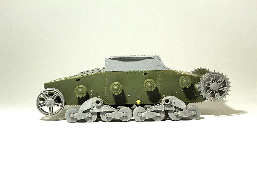 Потом собрал остальные части ходовой: ведущие колеса, "ленивцы", поддерживающие катки. Также на корпусе изобразил по бортам недостающие болты и клепки, характерные именно для химических вариантов машины.