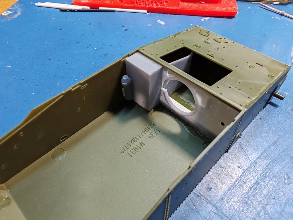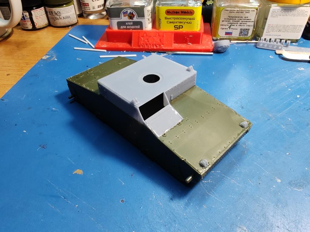 Далее переместился на корпус. В наборе имеются куча деталей для его совершенствования, включая башню и бронелисты. Дополнительно я купил решетку, но пока не ставил. Предлагаемый в конверсии верхний бронекорпус я полностью не использовал.