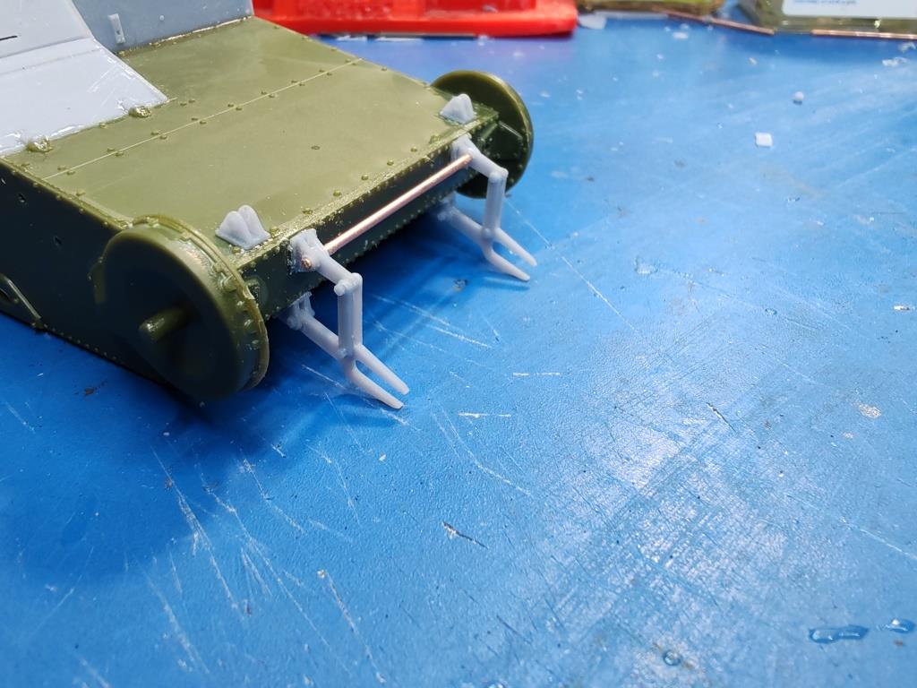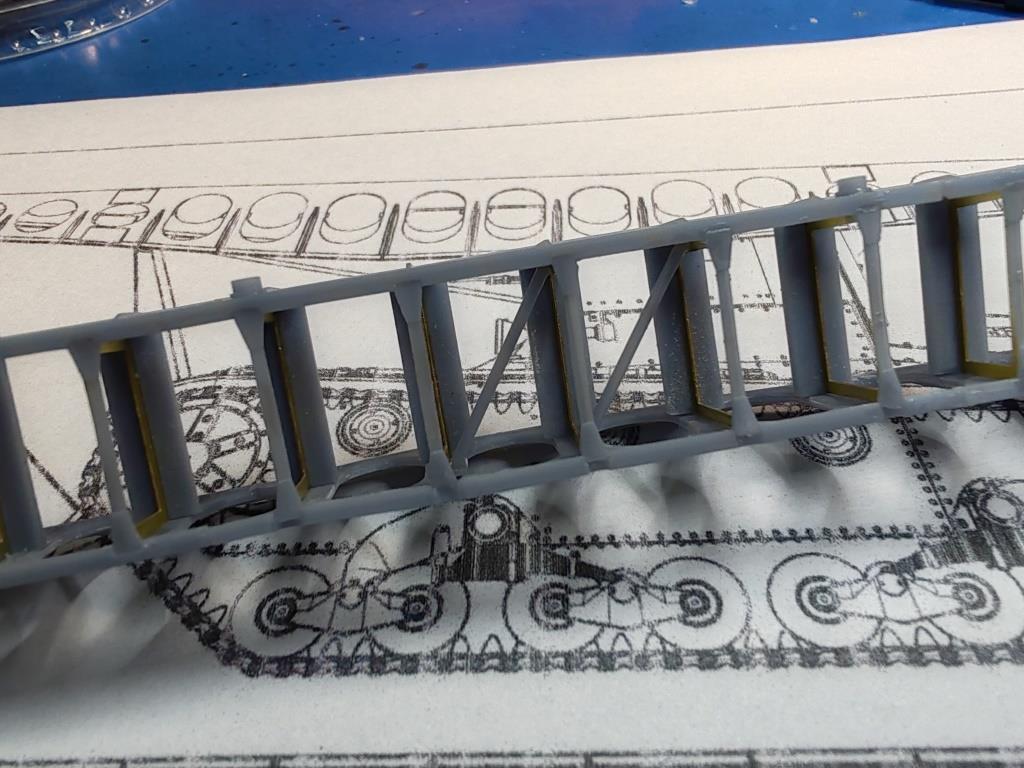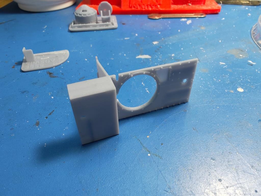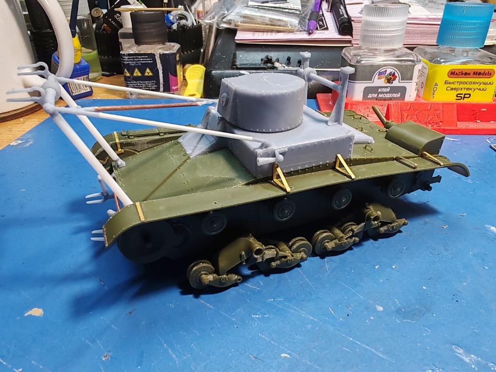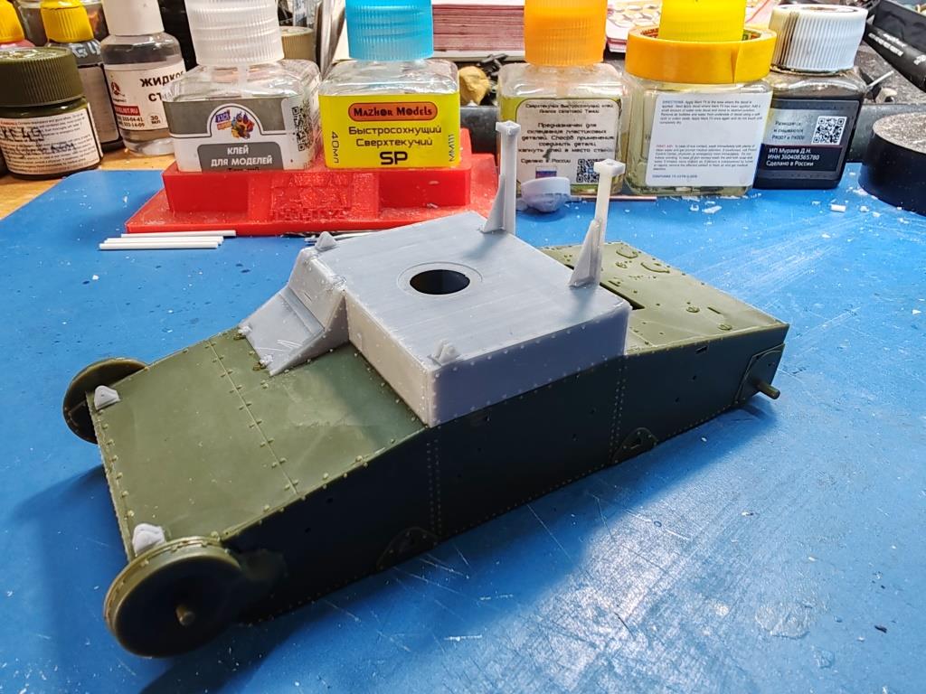 при всей красоте, верхний бронелист корпуса я оставил из набора. ЗД печать конечно хорош, но выемки по краям для четкой стыковки с корпусом не было. Да и садился он по месту чуток не очень. Рубку я собрал на ванне, а не так рак рекомендует инструкция, возможно именно из за этого, при склейке деталей верха на место приложил чуть усилие и результат не заставил себя ждать - излом, пришлось собирать по осколкам, тут уже ничего не поделаешь. Опять же согласно инструкции требовалось приклеить скобы крепежей подъемного механизма, этакие рога. Я так и сделал. Но вот дальнейшая сборка меня напрягла. Во-первых, отверстия в них снова имели меньший диаметр чем прутки, но еще к тому же соединительные болты так же ни в какую не хотели проходить в отверстие и садиться на место. Решение - расточить. но не тут то было ровно подлезть к уже приклеенным деталям практически не возможно. Во-вторых, тут супер клей применил свои свойства на славу, хрен отдерешь. Еще и как обычно мелкие финтифлюшки при демонтаже имели свойство свободного полета в разных направлениях вопреки всем законам физики. В-третьих, и это пожалуй самый важный косячок инструкции, соединительную латунную трубку надо по инструкции вставить чуть ли не под острым углом в направляющие отверстия опор, естественно с меньшим диаметром, но даже если бы он был подходящего размера, все одно ничего не вышло бы без излома. Поэтому отодрал кое-как, я собрал всю эту конструкцию отдельно и только потом установил на корпус. Плюс в том, что эта конструкция подвижна и благодаря рычажным соединениям довольно легко перемещается. Лишь бы не обломалась в дальнейшем.