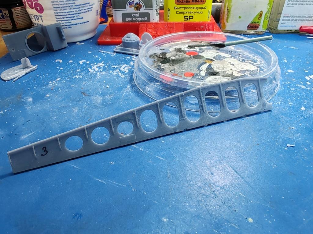 Отмечу, что несмотря на филигранную точность деталей, стыковка все же у меня не всегда происходила тика в тику, те же распорки моста к примеру я подтачивал по ширине, ну и конечно суперклей это еще та история использования, сколько раз отдирал его от пальцев не сосчитать.