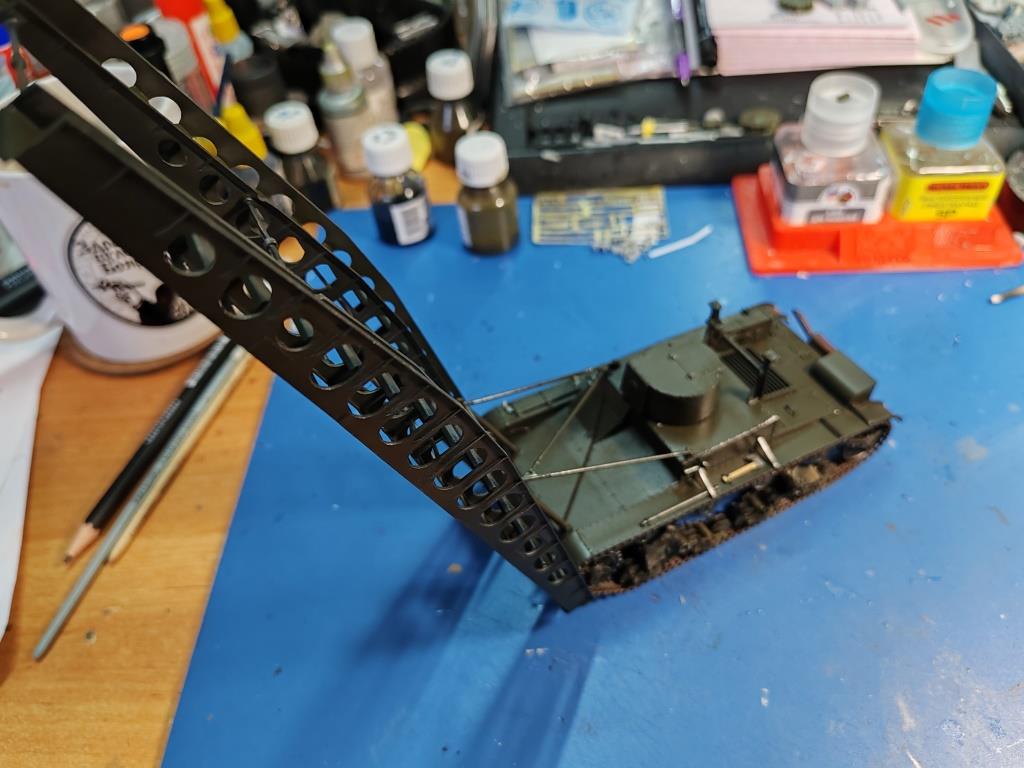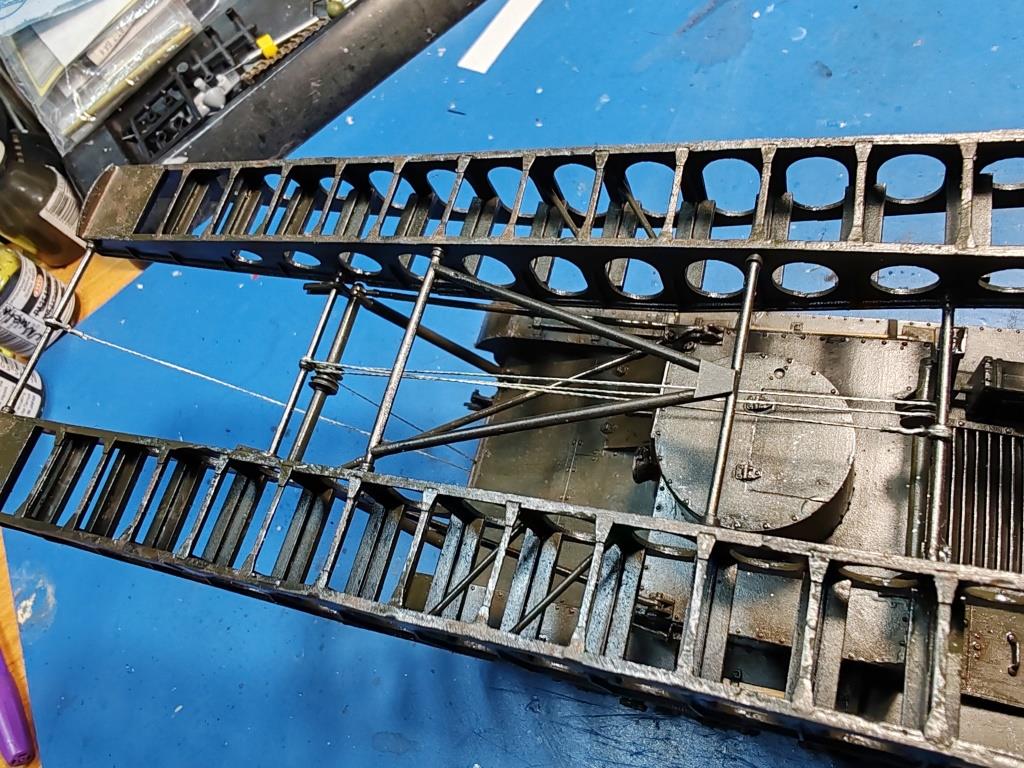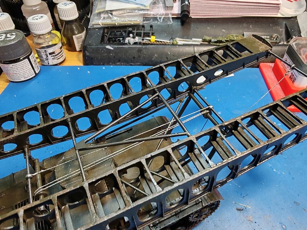 | Сегодня натянул тросы. Использовал плетенку от спиннинга, случайно попалась на глаза и пошла в дело. Оглядывался на фото из фронтовой иллюстрации. Если кто будет строить эту конверсию рекомендую заранее не доверяя инструкции оглядываться на фото. Расположение шкивов и блоков согласно инструкции по сборке конечно красиво не совпадает с реальным, пришлось мутить дополнительные прогоны троса.