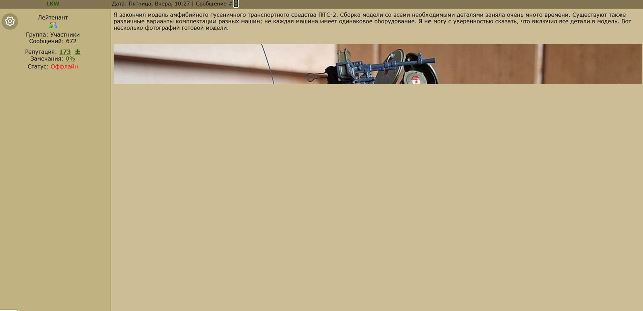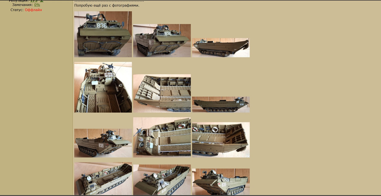 | Спасибо за сотрудничество в загрузке фотографий. Я рад, что вам понравилась модель. Мне было бы интересно узнать, видны ли вам фотографии КрАЗ-255Б ТММ-3, и отсутствуют ли все фотографии ПТС-2. Если да, то мне придётся разместить их все здесь заново.