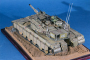 | Строилась "из коробки". Модель от ХоббиБоса широко известна своей кривизной, особенно по ходовке. Но при решающем критерии стоимости модели вместе с травлёнкой всего 1000 рублей не имеет конкурентов.))) Ничего не пилил, за исключением опускания на пару мм. вниз ступиц ведущих колёс, иначе гусеницу на левом борту не одеть)))). Комплекта башнецепей из набора вполне хватает, надо только смело уменьшить кол-во звеньев в каждой на ОДИН по сравнению с инструкцией. Травления в наборе достаточно. Переделал задние корзины, ХБ даёт почему-то от 4-ки. Добавил самодельных звеньев на бортовые экраны. Утырочные тросы буду менять, уже едет "Еврека". По маркировке это танк "11 Гимель" - заместителя командира 53-го (1) бронетанкового батальона «Sufa» (буря) 188-я танковая бригада «Барак». Буду рад замечаниям.