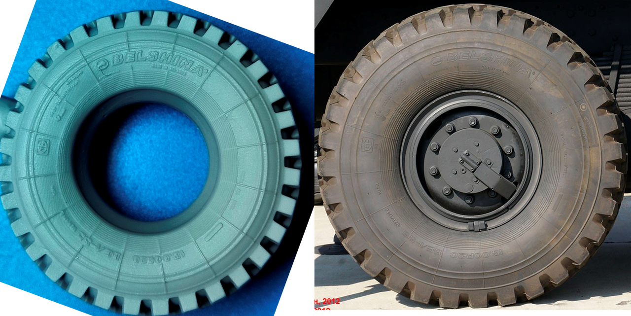 ....но никому не бросилось в глаза боковой протектор, по высоте он гараздо ниже прототипа, эмблема БелШины "Буйвол" растянута на боковичке, две спаренные риски по кругу не имеют плавного перехода,  мелкие надписи нарисованы поверх рисок, на прототипе между рисками , да и сами все риски по диаметру боковичка слишком огромные и выглядят просто топорно.. а литничек это шедевр, наверное самый большой литничек, который я только мог видеть на колесах....это так .. поверхностно что бросилось в глаза, а если взять штанген и начинать проверять диаметры дисков и шин ширину беговой дорожки и тд.. то не приятных сюрпризов найдется достаточно... особенно меня удивила просадка в виде грыжи, кторую так тщательно скрывали арматовцы во время обзора.