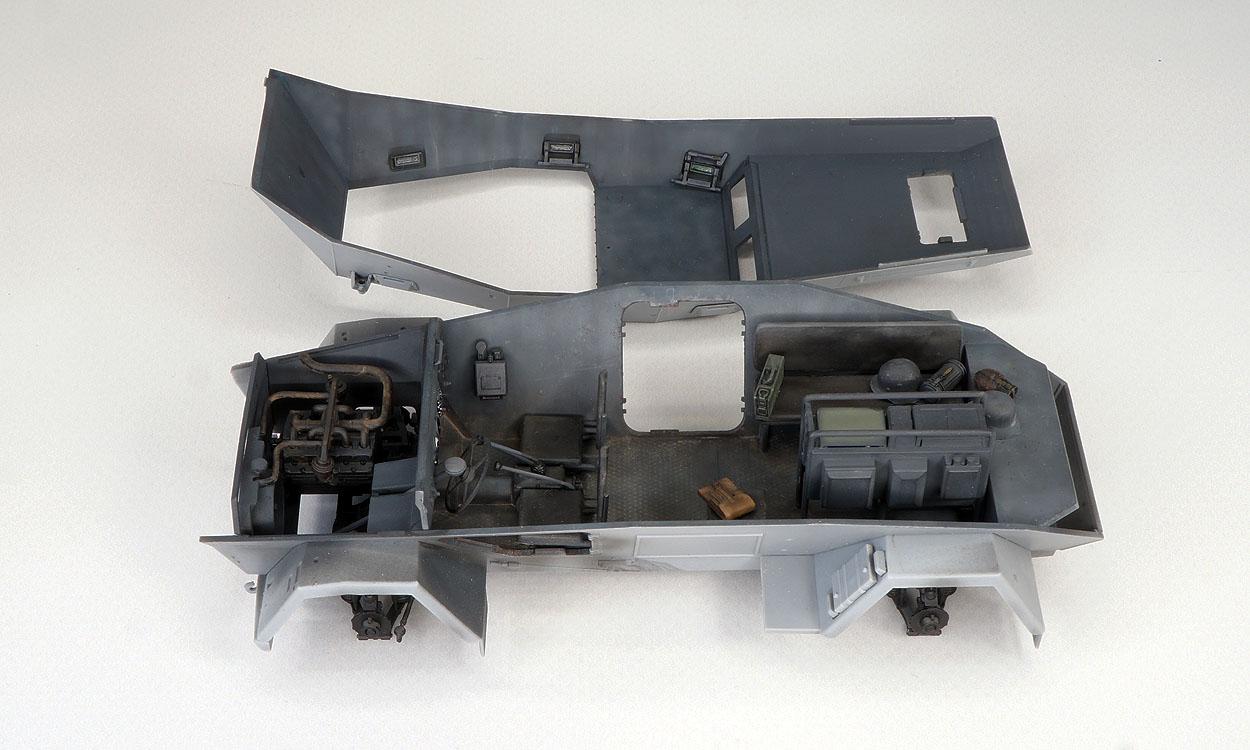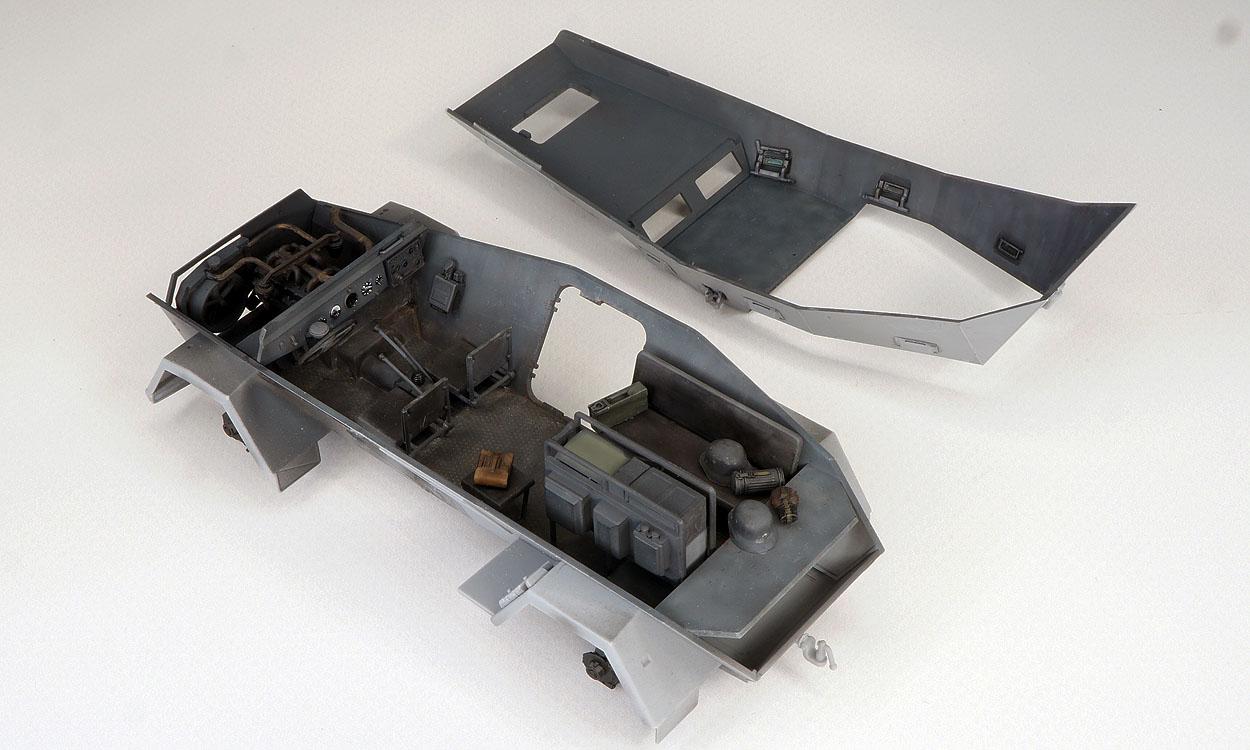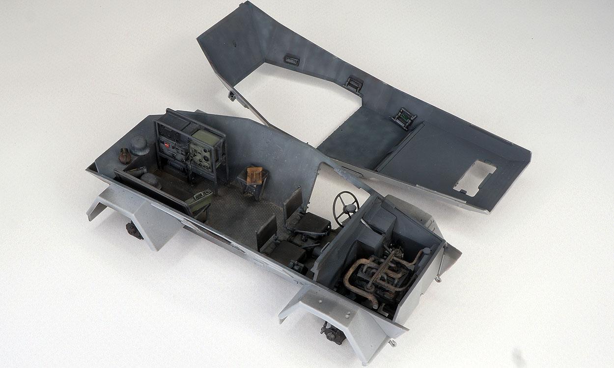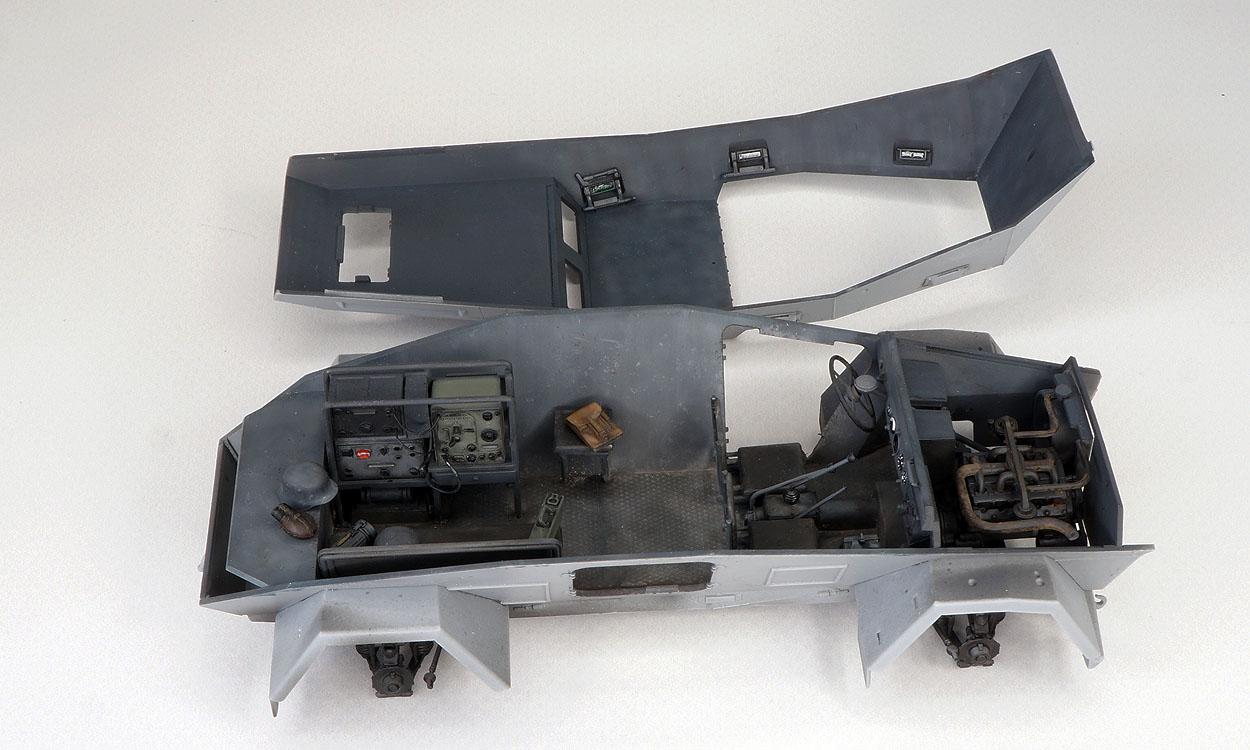 Работа на интерьером закончена (к сожалению, найти каких-либо детальных фото реального аппарата мне не удалось, доверился производителю). Получился он аскетичным. Разнообразил его отдельными деталями (каска, газбак, планшет, фляжка, пулемётный короб). Изюминкой данного аппарата является "радийный блок". У производителя он получился достаточно хорошим, точно распознаются станции: LORENZ 100WS, 30 W.S.a/80 W.S.a и , возможно, Torn. E. b. От себя добавил некоторую проводку (ее размещение может быть вариативным). В помощь сайт: www.laud.no/ww2/ По цвету станций, проводке, названиям - масса вопросов сразу отпадет. К сожалению, производитель не сделал один "циферблат" панели приборов и дал недостаточное количество ручек для закрытия\открытия откидных лючков. Несколько фото с разных ракурсов дадут представление об интерьере модели, т.к. его передняя часть после установки верхней детали корпуса будет затруднена для просмотра.
