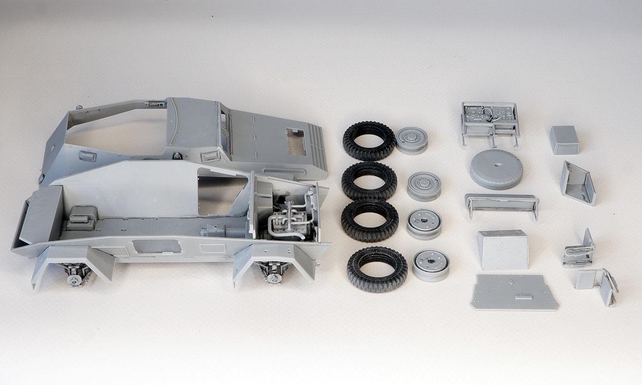 | Новый проект.. Выбор пал на Sd.Kfz.247 Ausf.b от фирмы ICM. Все детали отделены, зачищены (на фото лишь крупные из них). Масса мелочевки осталась за кадром.. Отшлифовал резиновые покрышки (удалил стыки)
